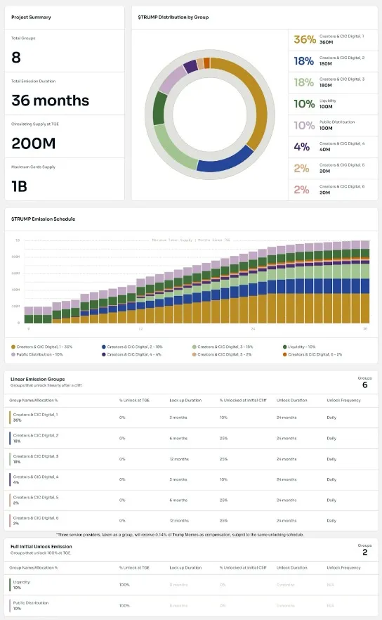 80% — предназначено для создателей и компании CIC Digital, связанной с NFT-проектом Дональда Трампа (вестинг на 24 месяца), а также дальнейшее развитие проекта.