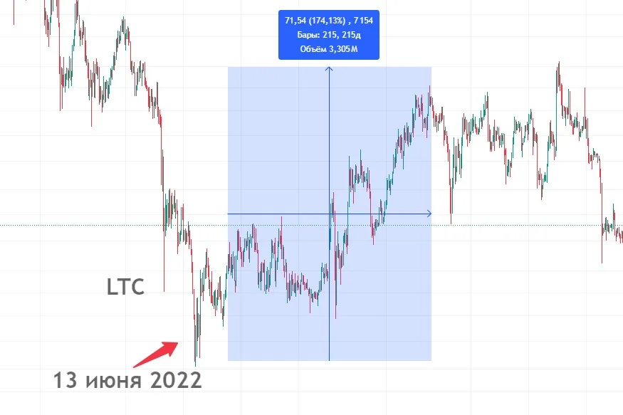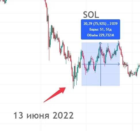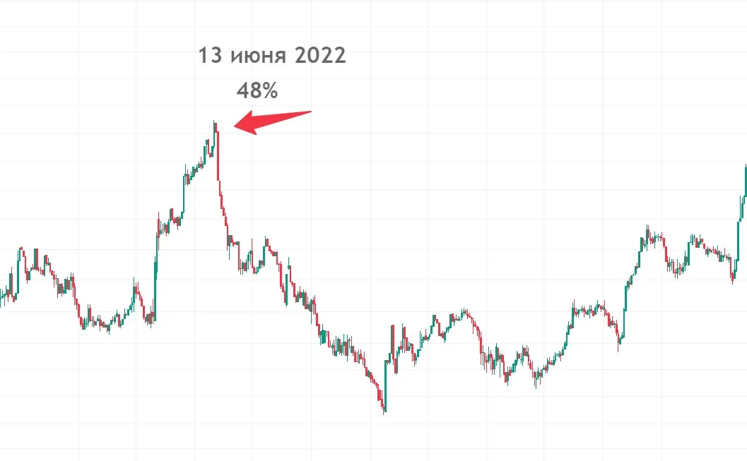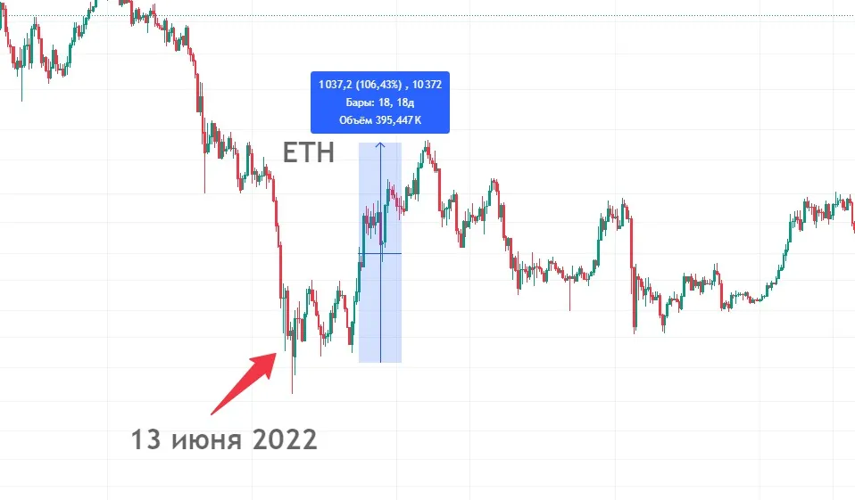 Один из примеров был 13 июня 2022 года. Доминация биткоина начала быстрое снижение, что свидетельствовало о выходе капитала из актива. В этот же день ETH дал сильное движение более чем на 100%.