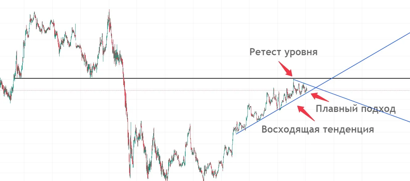 Индикатор почти дошел до ретеста бывшей поддержки, которая является важным уровнем. После пробития поддержки цена не отретестила ее, и теперь это уровень сопротивления. Также наблюдается плавный подход к наклонному уровню, который определяет восходящую тенденцию. Если цена продолжит консолидироваться у уровня поддержки, то увеличится вероятность импульсного пробоя.