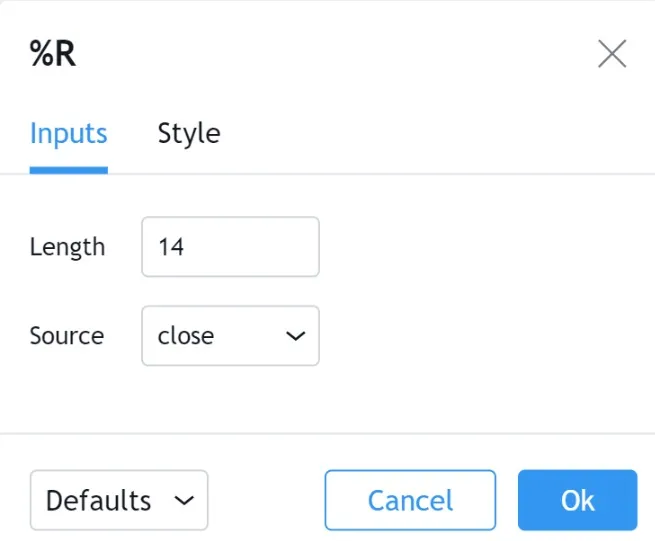 %R = (Наибольшая цена за период - Цена закрытия) / (Наибольшая цена за период - Наименьшая цена за период) × (-100)