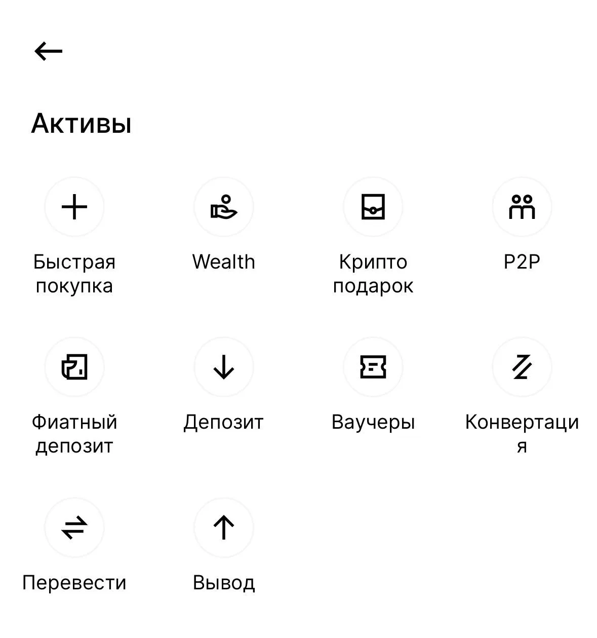 1. В главном меню перейдите в раздел Активы, выберите значок с надписью P2P