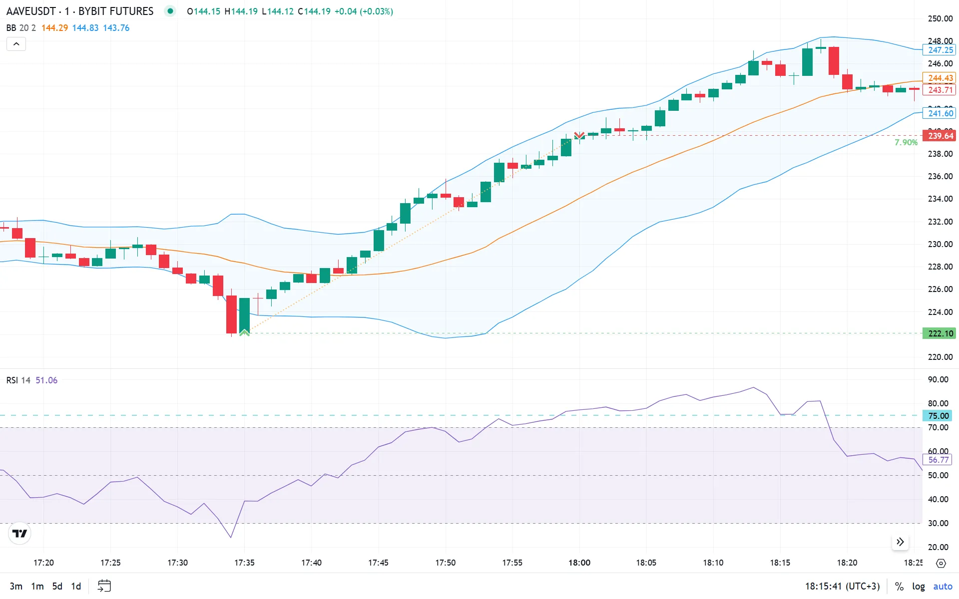 RSI (Індекс Відносної Сили) — це “градусник” ринку. Він вимірює, наскільки AAVE “перегрітий” або “переохолоджений”, за шкалою від 0 до 100.