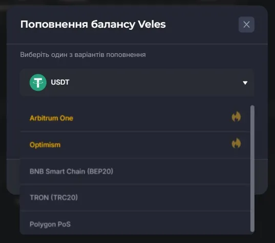 Так, для поповнення балансу рахунку на платформі Veles можна використовувати кілька блокчейнів. Наприклад, популярний токен USDT можна відправити на свій рахунок через блокчейни BNB Smart Chain і TRON, а також через мережі другого рівня (надбудови над блокчейном Ethereum): Arbitrum, Optimism і Polygon.