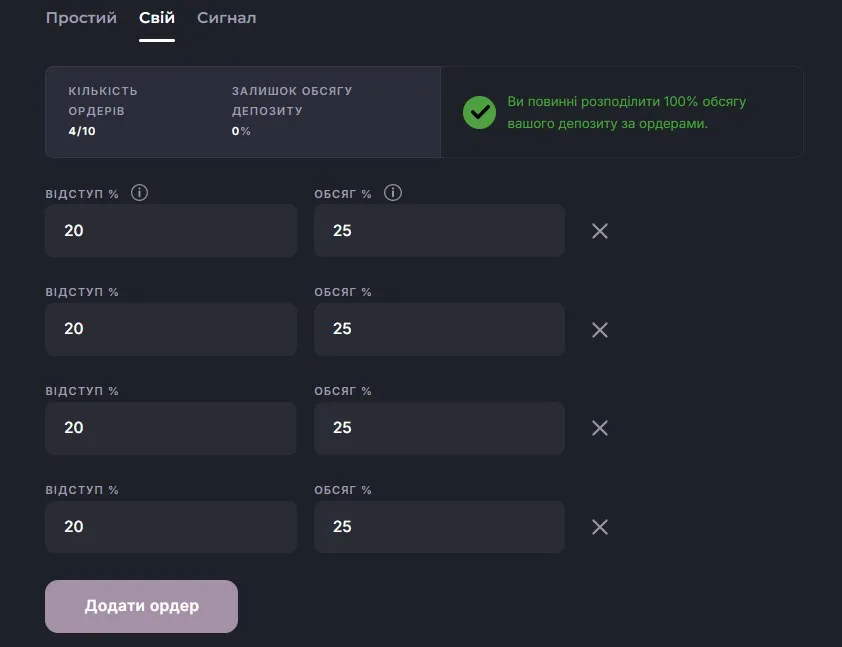 якщо ордер на продаж виставлено за 1,000 USD, ордер на купівлю повинен стояти на рівні $0,998.
