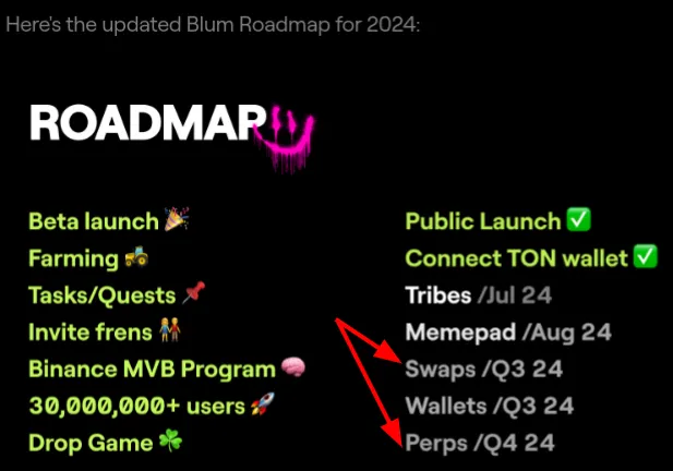 Blum трохи відстає від заявленої дорожньої карти. Третій квартал закінчується, а обміни, які було обіцяно запустити в цьому кварталі, поки недоступні. Проте всі попередні етапи реалізовано, і це означає, що команда зараз активно працює саме над обмінами. Щойно вони будуть готові, можна буде сказати, що продукт створено.
