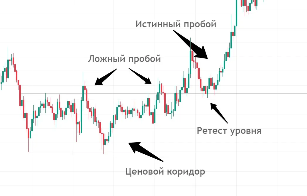 Ще однією деталлю цінового коридору є закол рівня. Його відмінна риса від помилкового пробою полягає лише в заколі рівня тінню. Помилковий пробій - це закриття свічки за рівнем і обов’язково з тілом.