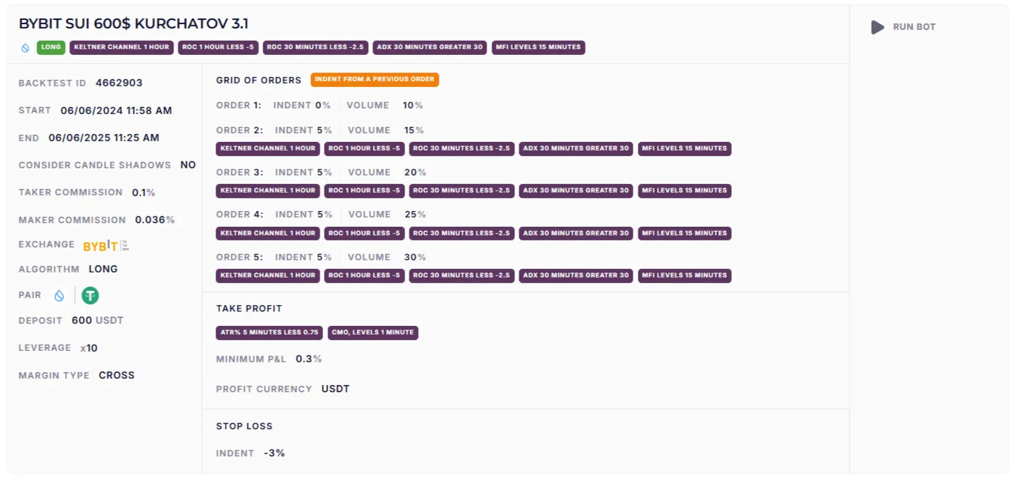 - Стоп-лосс: -3% від останнього ордера, щоб обмежити ризики.