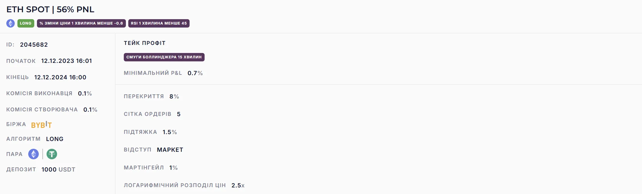 Бот відкриває угоду на різкому падаючому русі ринку. Налаштований із 8% сіткою перекриття.