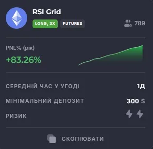 Опис: Бот із широкою сіткою ордерів, розставляє ордери в 20% перекритті. Для входу використовує сигнал комбінації індикаторів RSI на молодшому і старшому таймфреймі.