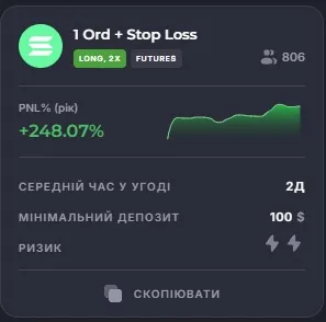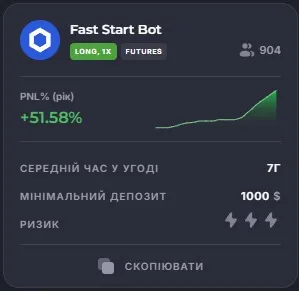 Опис: Бот для невеликого балансу в 50 USDT з х2 плечем. Миттєво входить в угоду за ринковою ціною, використовуючи фільтр «Ціна > 0». У наступних додаваннях ордерів використовує функцію усереднення за сигналом, що дає змогу постійно залишатися в ринку й ефективно набирати позицію.