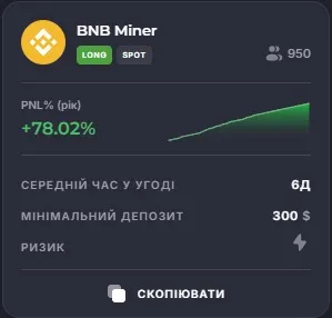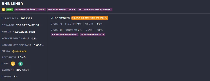 Опис: Спотовий бот для заробітку BNB, які можна використовувати для отримання знижок на комісії на Binance. Для торгівлі встановлено депозит у 300 USDT. Для опціонального усереднення угоди необхідно мати в розпорядженні 600 USDT, які в разі просадки потрібно розділити на два ручних усереднення.