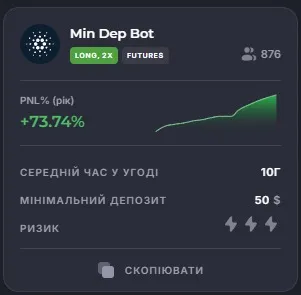 Опис: Спотовий бот з короткою сіткою перекриття в 11%. Для входу в угоду задіює низку трендових індикаторів і канальний індикатор Дончіана на молодших таймфреймах для збільшення частоти входу. Закриває угоду за сигналом індикатора RSI на перепроданості.