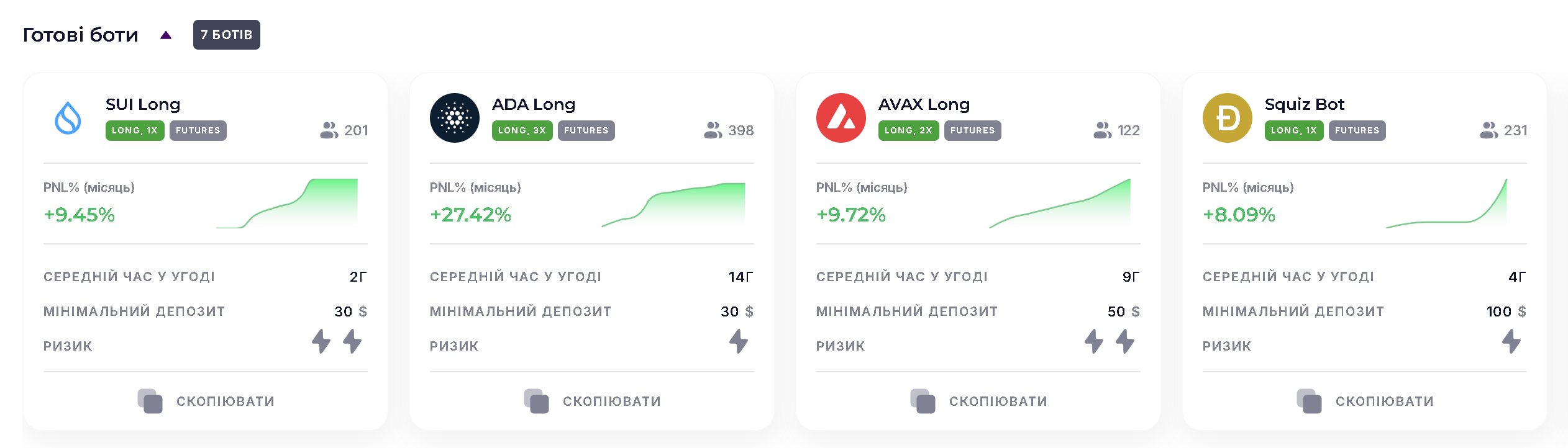 | Squiz Bot | | +7% | 4Д | $100 | | Спробувати |