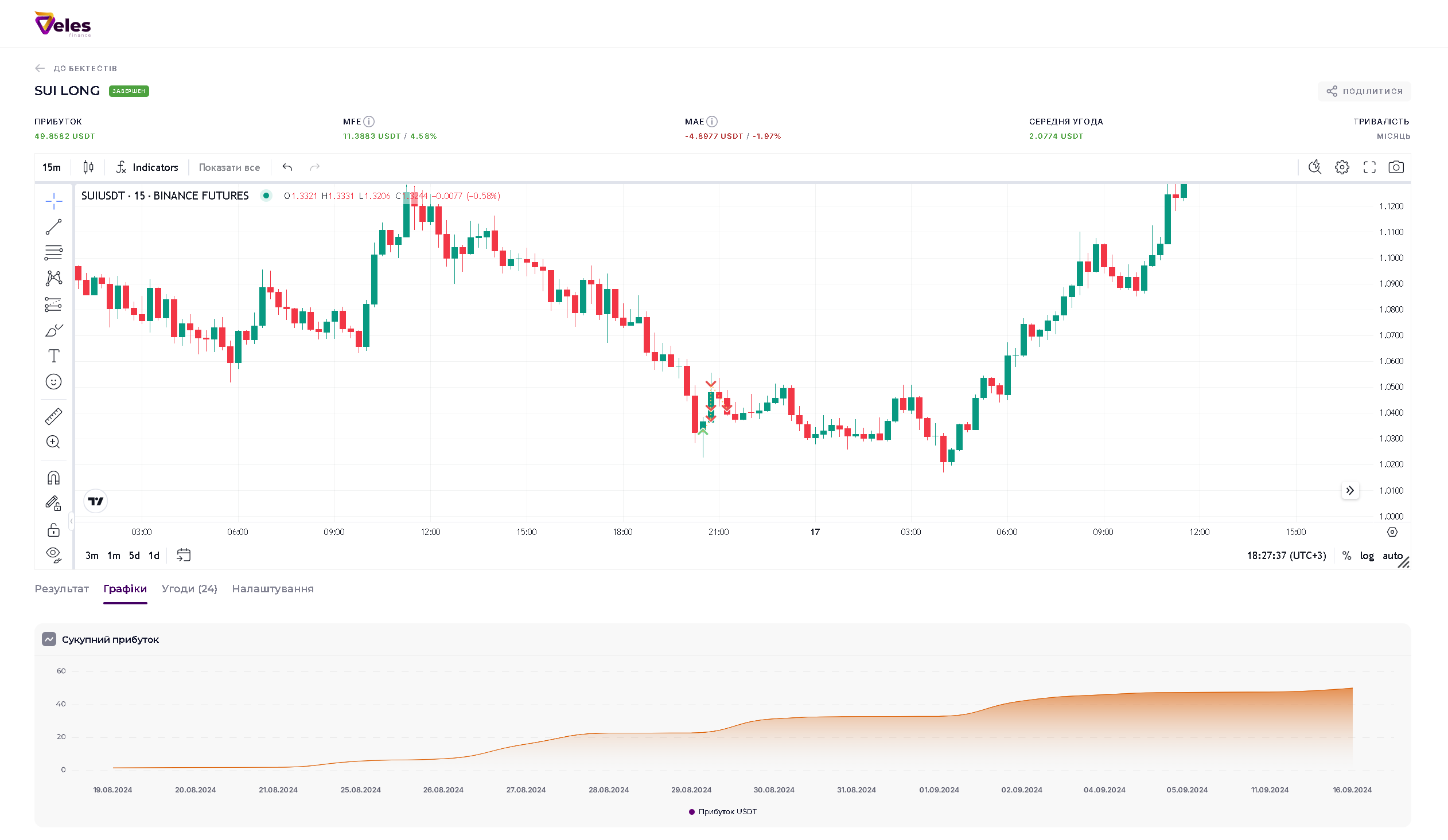 Платформа Veles дає змогу користувачам створювати власних торговельних ботів, налаштовуючи параметри входу і виходу, а також комбінуючи різні індикатори для розробки унікальних стратегій.