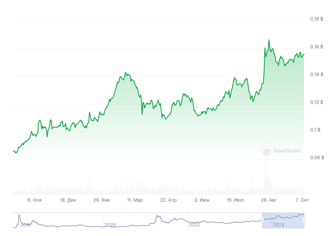 За останній рік курс TRX/USD демонструє стійке зростання, і це означає, що трейдери, які використовують DCA-бот для цієї пари, за рік набрали б позицію, середня точка входу якої істотно нижча за поточну ринкову ціну.